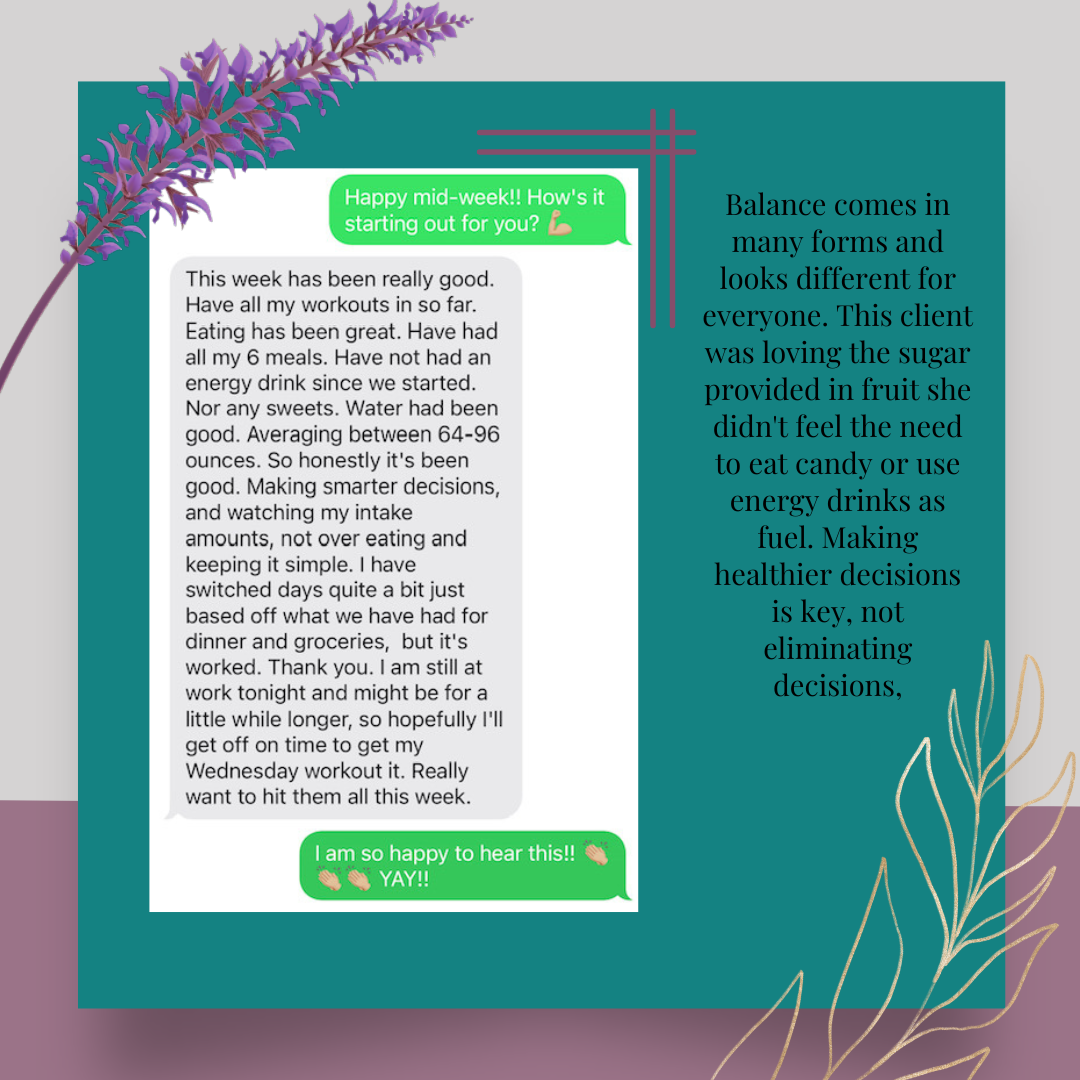 JUST 26 days!! She went from 50-100g of sugar per day to under 30g! She eats more food but lighter portions throughout the day and moves her body more! Simple changes, made over longer periods of time, are key to long term weight loss and creating healthier HABITS. One of her goals is leaning down, so nutrition balance and strength training is how we are working towards that goal. These small adjustments to her lifestyle have already shown huge benefits - she is fitting better in clothes, having more energy, and not having sugar/hunger cravings. Rockstar status!!